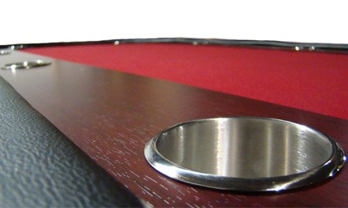 Poker Tables Item ID: #240Item DescriptionThis is our red poker table with racetrack and stainless steel cup holders. This poker table has a vinyl rail with extra thick foam padding. The racetrack is wooden with a dark wood veneer that enhances the luxurious look of this poker table. This poker table has two sets of folding legs that allows for easy set up and convenient storage. The table playing surface is also padded to reduce chip bounce and minimize messy pots. Our tables are made with a thick 2 cm board. This extra thick wooden board makes this poker table extra strong to ensure durability. A thick board allows for longer screws for your table legs and frame to affix to the wooden board. Longer screws ensure a more stable and durable poker table. Also, a thicker poker table ensures a more rigid playing surface to avoid table sags, bowing and damage from player abuse and leaning. Dimensions of this table are : 84″ x 42″ The wooden racetrack has a dark wooden veneer that enhances the luxurious appearance of this poker table. Wooden racetracks are great for stacking chips! The rail is made from a durable vinyl with extra heavy duty foam cushion. This table has ten cup holders and seats ten players. |